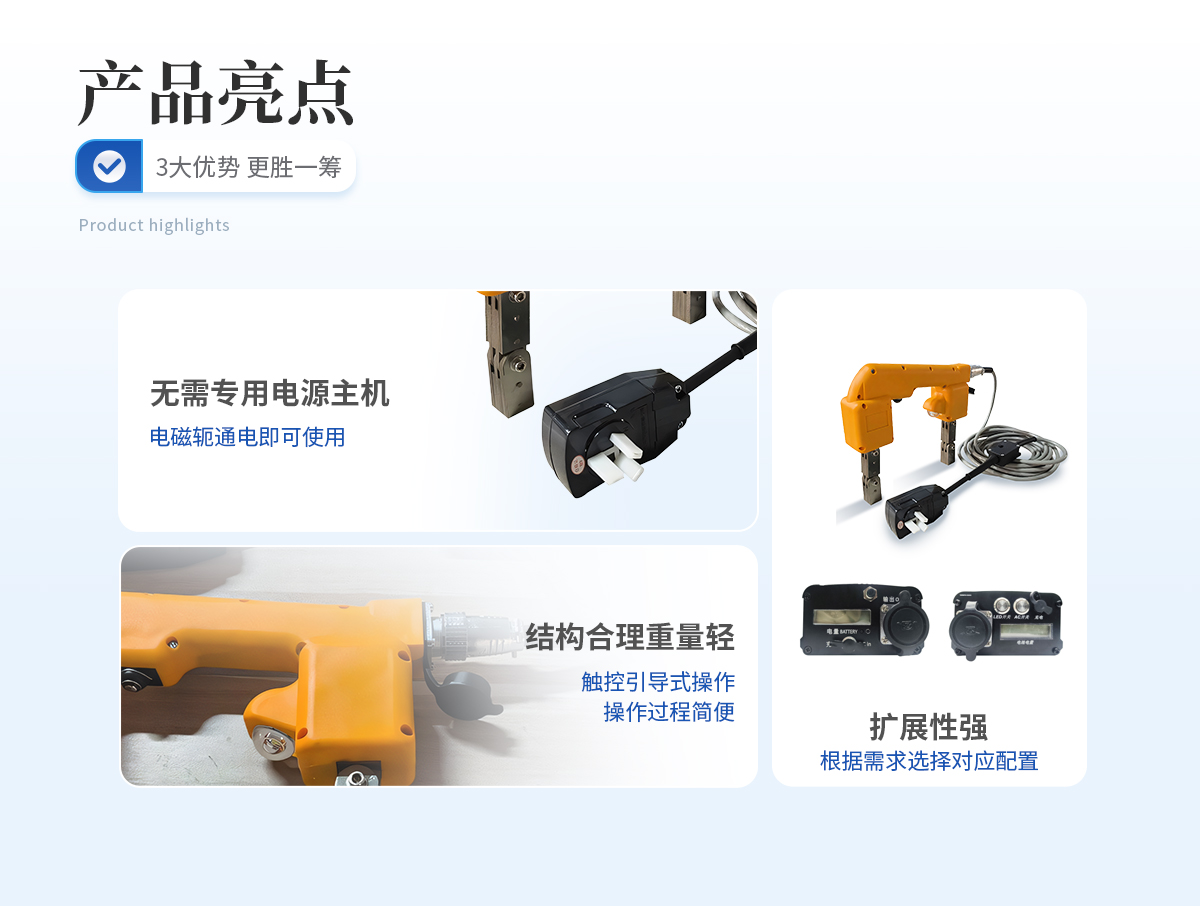 | 1、 无需专用电源主机,电磁轭通电即可使用; | 2、 体积小巧,重量轻; | 3、 开模制作,结构合理,手感舒适; | 4、 磁轭标配白光灯,可选荧光灯(不额外加费用); | 5、 配专用仪器箱; | 6、 扩展性强,可根据需要增配对应的专用电池包,通过专用电源来实现交流、直流磁化功能。可满足不方便拖电源线的场所使用。 |