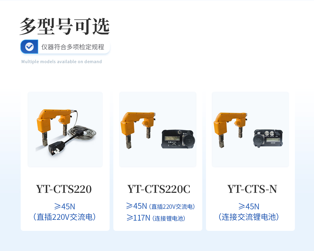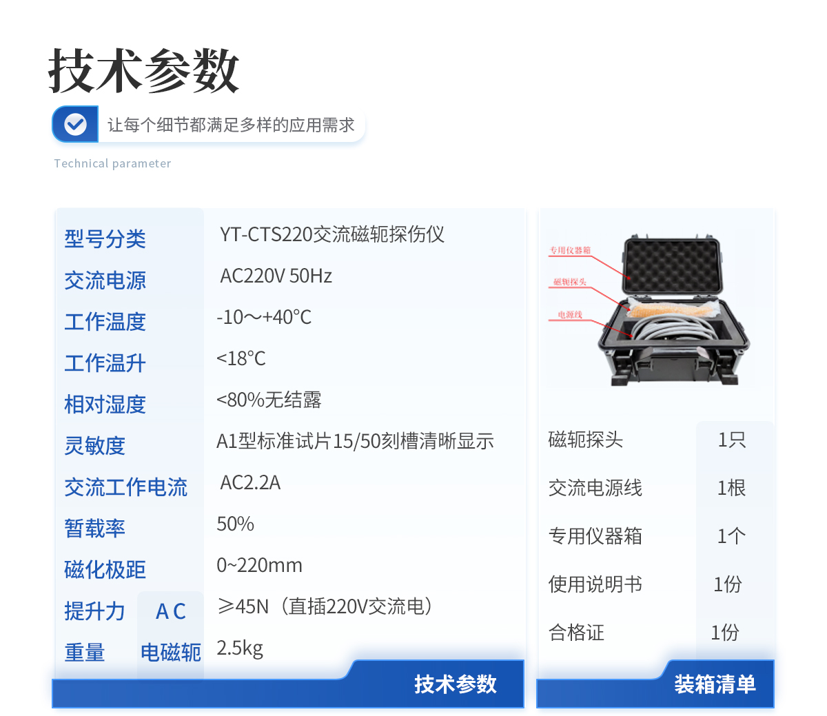 YT-CTS220C型电磁轭磁粉探伤仪,无主机设计,操作简单方便,噪音小、重量轻、工作稳定。配直流磁化电源(锂电),具有交流与直流磁化功能,适用于野外无电源现场操作以及高压不能进入的容器、桥梁、管道等现场操作,一次充电连续工作时间可达6小时以上。交流供电电源采用~220V电源直接输入,无需其他仪器配套,操作方便、简单、重量轻、便于携带,因而该仪器得到广泛使用。