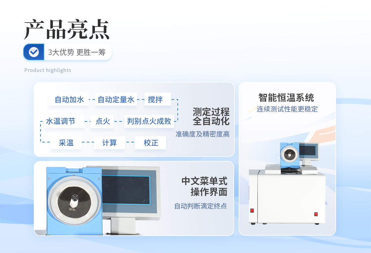 | 1、采用单片机系统来控制仪器,实现启动后自动加水、自动定量水、搅拌、水温调节,点火、判别点火成败、采温、计算、校正 。 | 2、装氧弹外,实现测定过程全自动化,无人为误差,准确度及精密度高。 | 3、中文菜单式操作界面,在中文大屏幕液晶提示下,用户装好氧弹即可完成实验过程。 | 4、根据用户需要可加备USB插口,和windowsXP操作系统,即可实现微机控制。 | 5、结构合理,制作精良,测量准确度高,分析速度快,性能稳定,抗干扰能力强,使用可靠 | 6、性能稳定、故障率低、系统常数和实验结果可长时保存并且关机后不丢失等特点。 |
