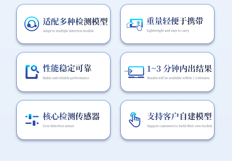 仪器重量轻体积小,既可作为实验室检测仪器,又可携带到田间地头、生产一线实现快速检测。仪器核心采用进口高性能光谱分析系统,具有体积小、性能优、稳定性强等特点,检测精度达到国际同类仪器水平。
