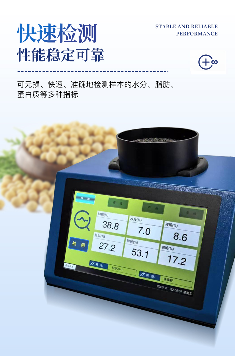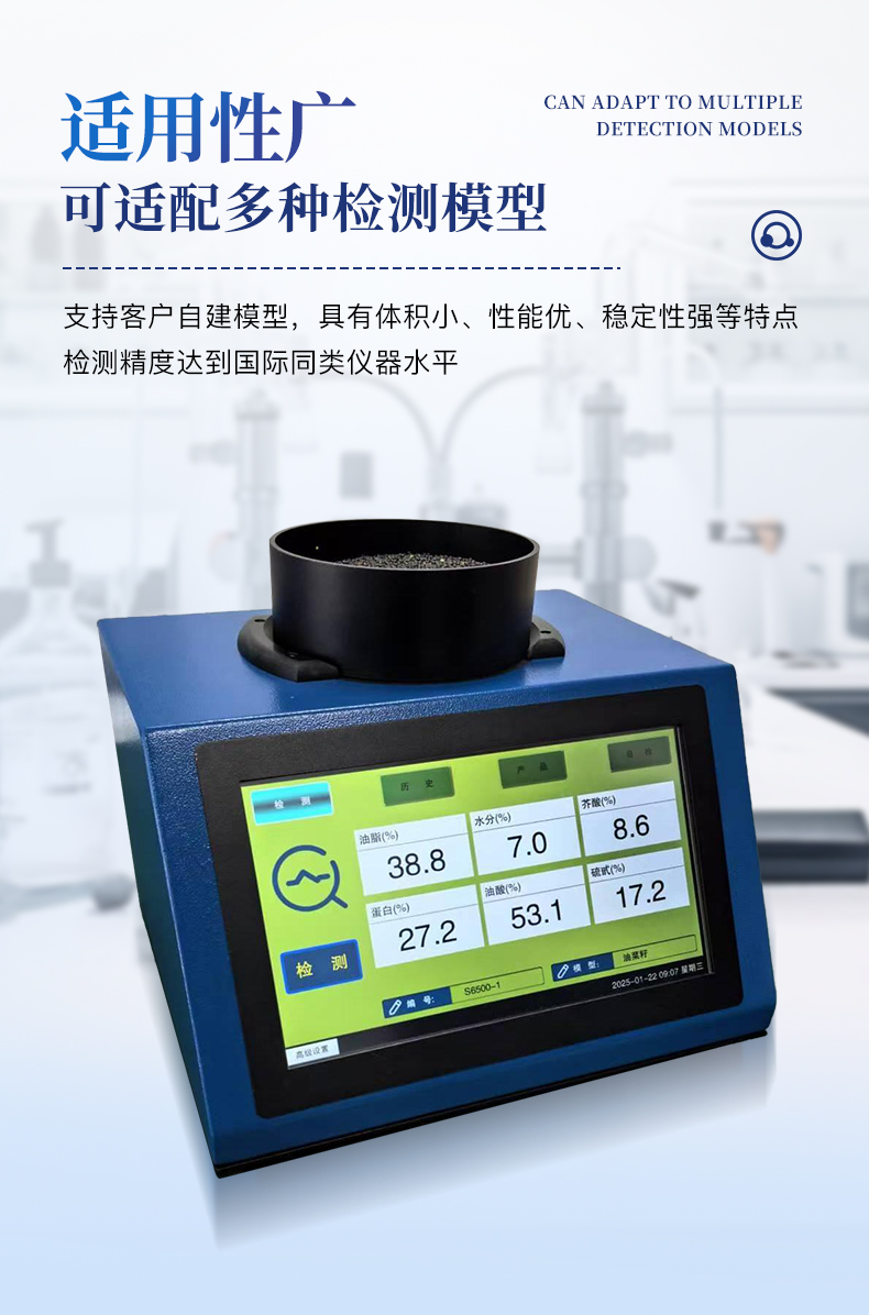 近红外光谱分析仪,是针对原粮、食品、饲料等行业开发的专用 检测设备,可无损、快速、准确地检测样本的水分、脂肪、蛋白质等多种指标。