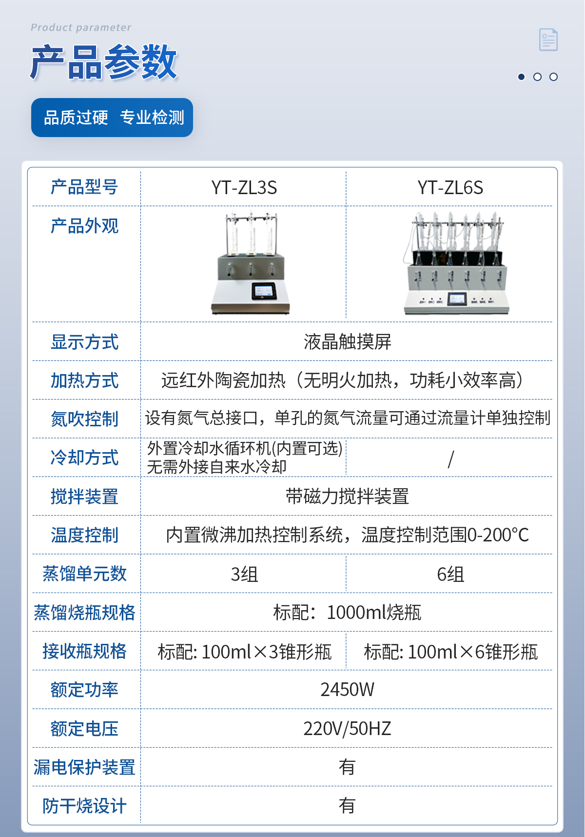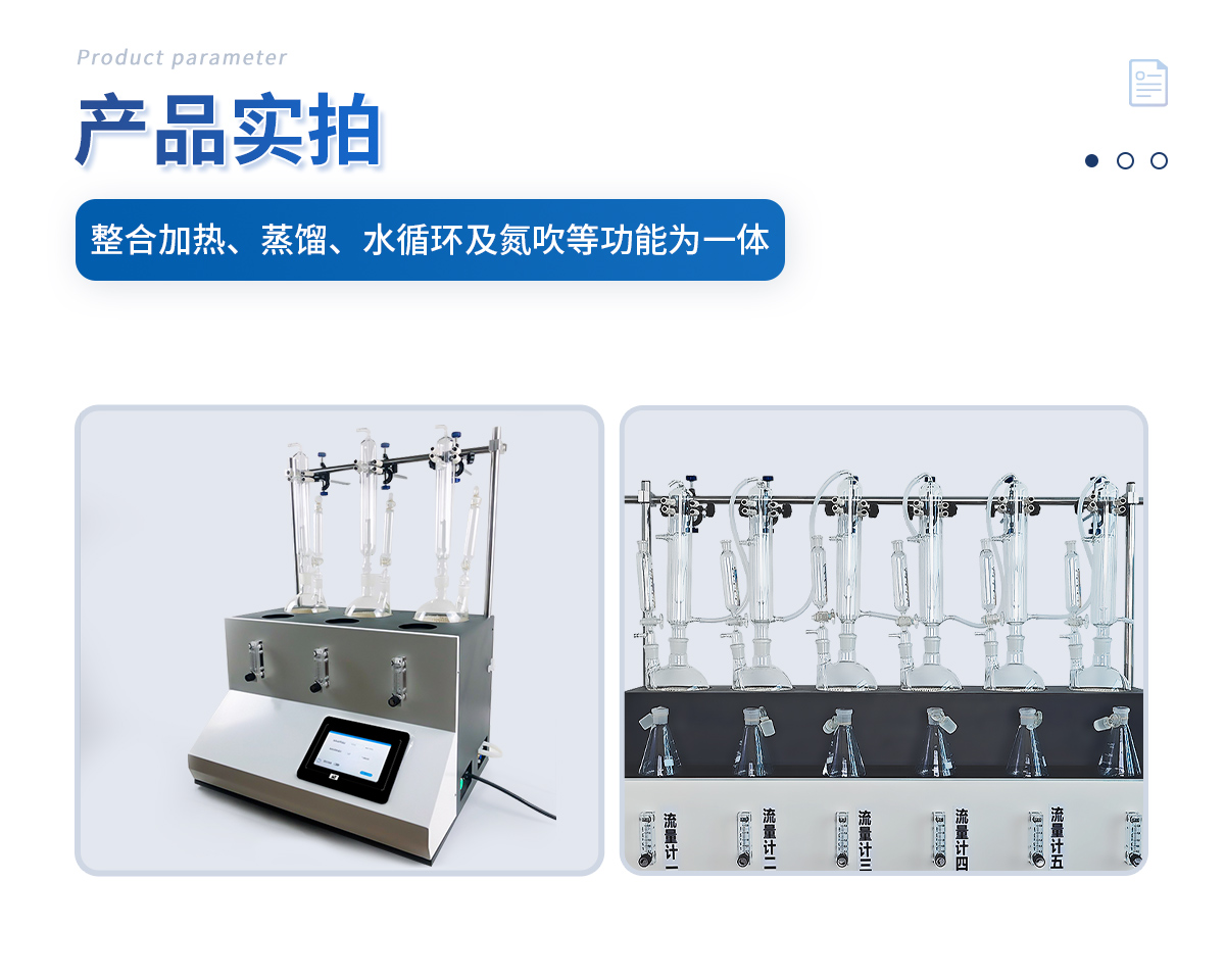 主要原理是根据药典中所提供的检测方法,将中药材以蒸馏法进行处理,样品中的亚硫酸盐系列物质加酸处理后转化为二氧化硫后,随氮气流带入到含有双氧水的吸收瓶中,双氧水将其氧化为硫酸根离子,采用酸碱滴定法测定,计算药材及饮片中的二氧化硫残留量。本产品在严格遵循药典要求的基础上,整合加热,蒸馏,水循环及氮吹等功能为一体,可同时提供3-5个样品(空白样,平行样)的处理,从而极大的提高了检测数据的精度和减少了工作时间。