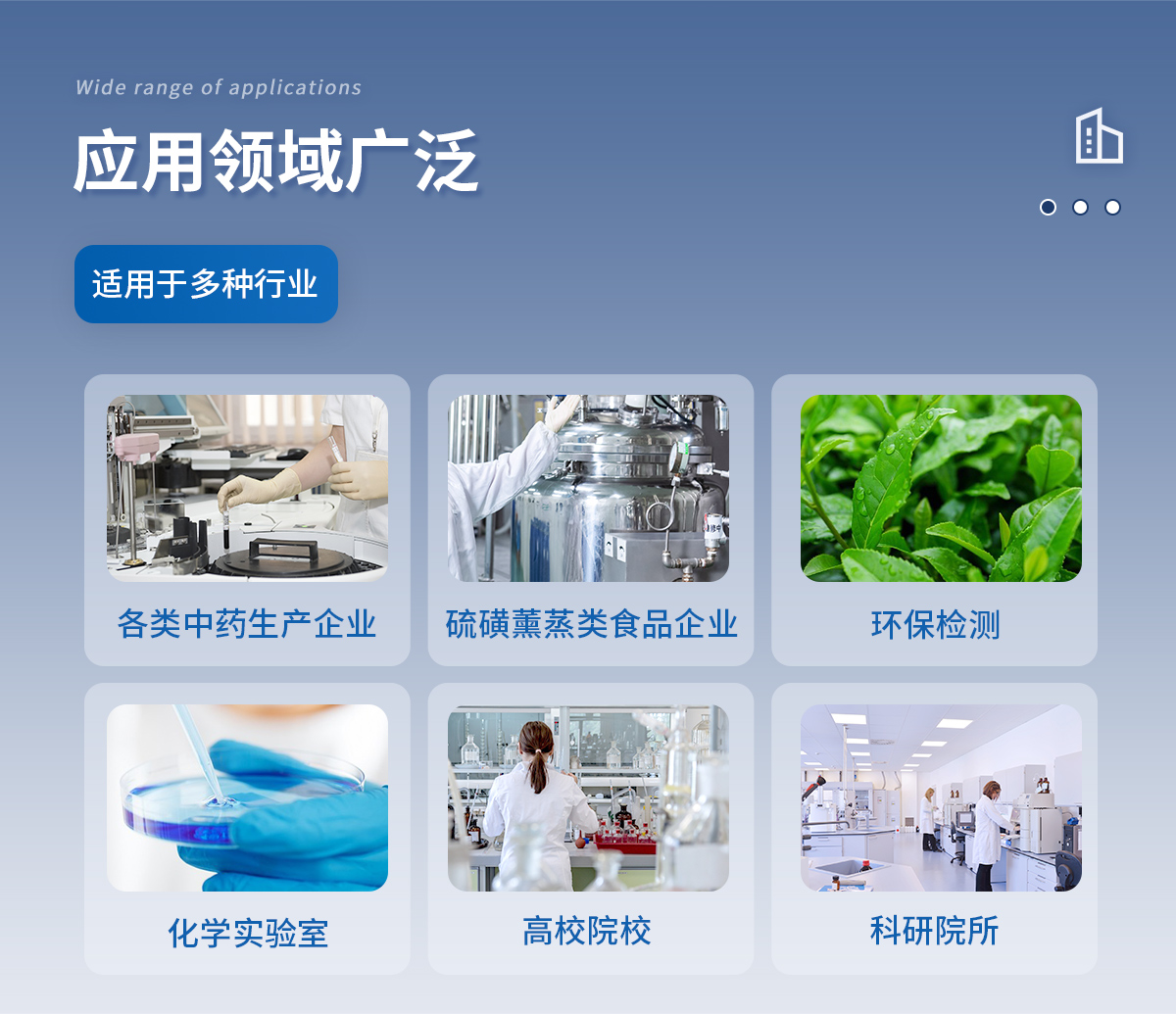 该仪器主要适用各类中药生产企业,中药科研院所,以及与硫磺薰蒸相关的食品生产企业等,用于常规二氧化硫残留量测定。