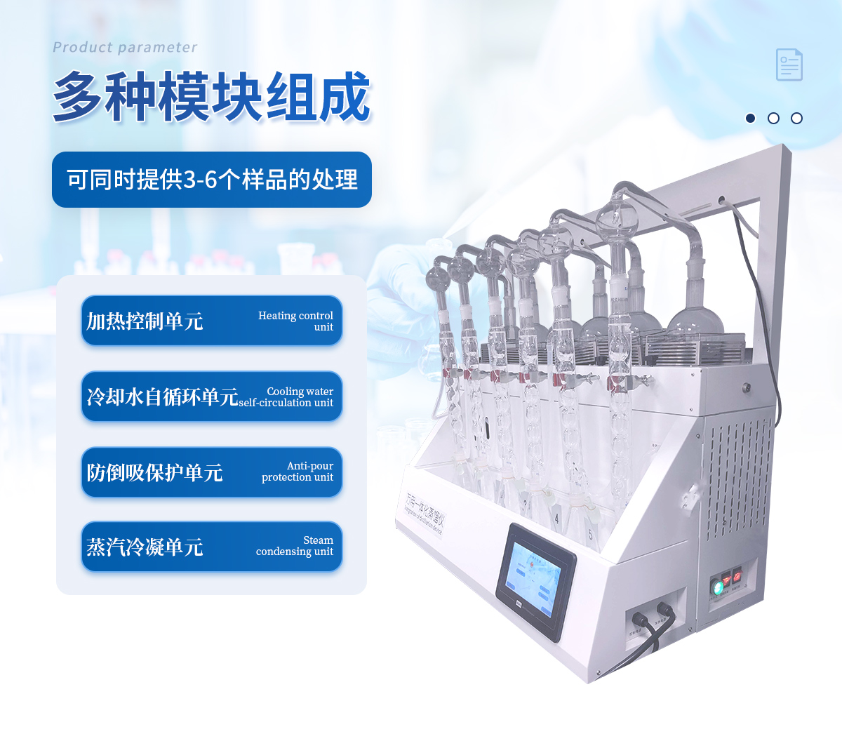 主要原理是根据药典中所提供的检测方法,将中药材以蒸馏法进行处理,样品中的亚硫酸盐系列物质加酸处理后转化为二氧化硫后,随氮气流带入到含有双氧水的吸收瓶中,双氧水将其氧化为硫酸根离子,采用酸碱滴定法测定,计算药材及饮片中的二氧化硫残留量。本产品在严格遵循药典要求的基础上,整合加热,蒸馏,水循环及氮吹等功能为一体,可同时提供3-6个样品(空白样,平行样)的处理,从而极大的提高了检测数据的精度和减少了工作时间。