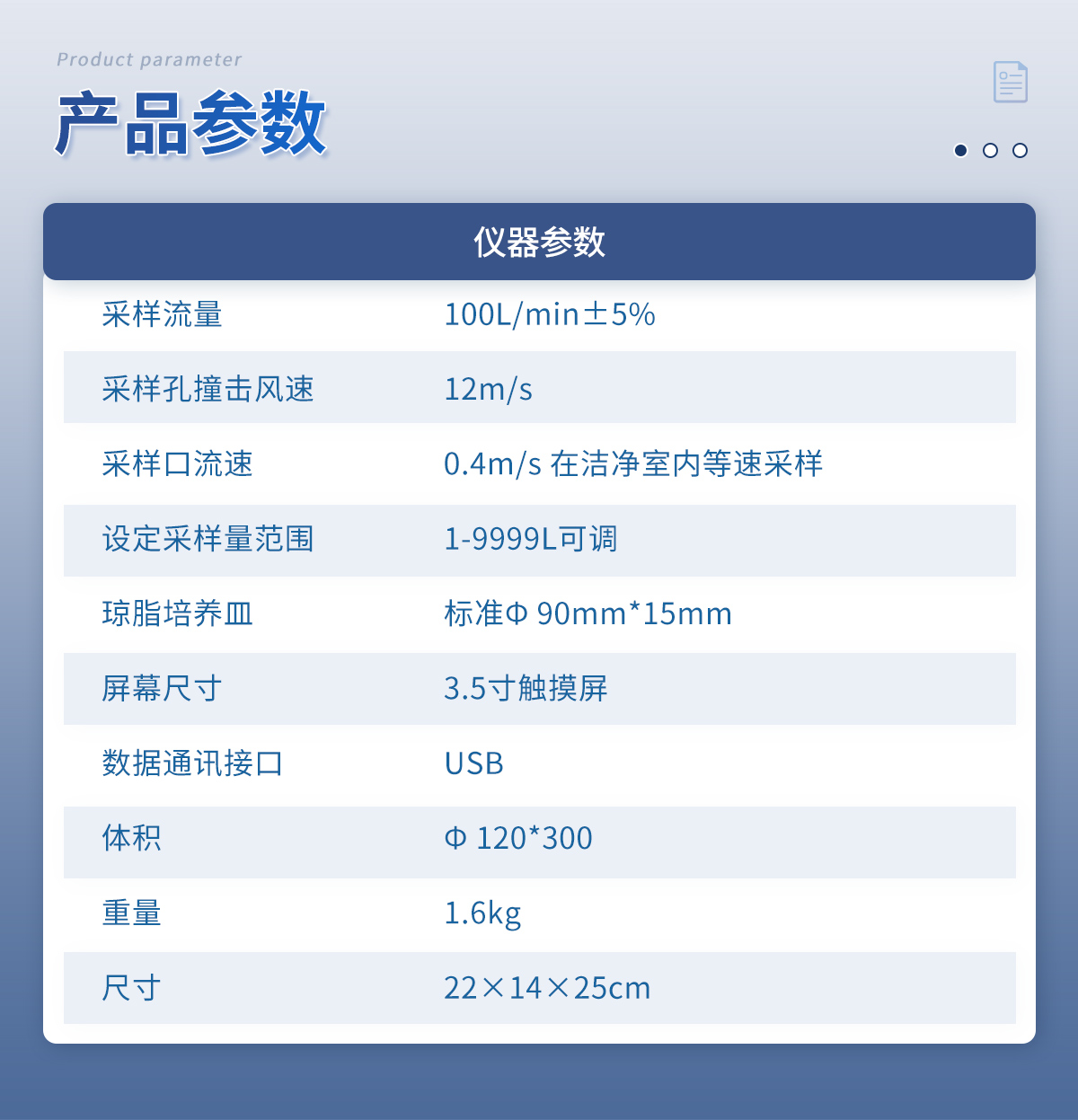 采样流量:100L/min±5% 采样孔撞击风速:12m/s 采样口流速:0.4m/s 在洁净室内等速采样 设定采样量范围:1-9999L可调 琼脂培养皿:标准ɸ 90mm*15mm 屏幕尺寸:3.5寸触摸屏 数据通讯接口:USB 体积:Φ 120*300 重量:1.6kg 尺寸:22×14×25cm