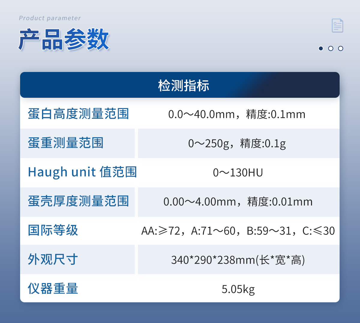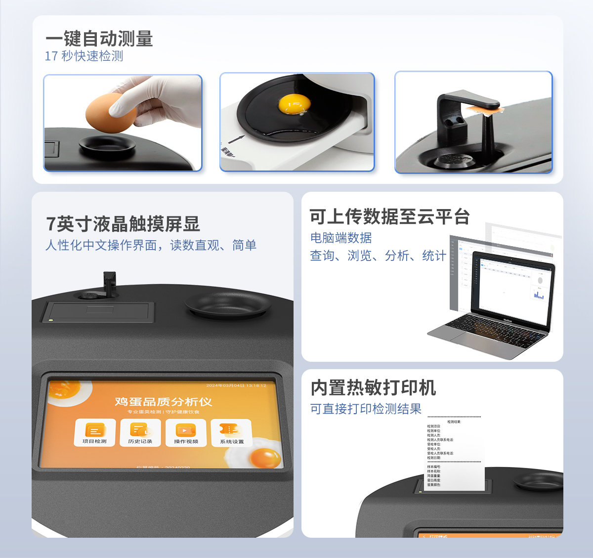 | 1.仪器采用7英寸液晶触摸屏,搭配运行安卓智能操作系统,主控芯片采用ARM Cortex-A7,RK3288/4核处理器,主频1.88Ghz,操作方便,性能更强。 | 2.仪器采用智能化控制,可一键自动测量蛋重、蛋白高度、新鲜度(哈夫单位)、蛋黄高度、蛋壳厚度。 | 3.高精度数字传感器,测量结果精度高,稳定性好。 | 4.创新采用高精超声波传感器测试蛋白高度,精密传感器测试蛋黄颜色,无需直接接触蛋液,减少误差存在。 | 5.仪器测试性能稳定,不受操作人员的能力影响,方便简单。 | 6.可一键自动测量哈夫单位、蛋重、蛋白高度、蛋黄高度和蛋壳厚度,把测试时间缩短到 17 秒。 | 7.仪器可本机存储数据,可连接USB端口将数据导出存储。另外,仪器自带数据上传模块,具有WIFI联网上传、RJ45网线连接功能,数据可实现局域网和互联网数据上传,检测结果可选择直接传至数据平台,进行大数据分析处理与数据统计,达到长期分析监测的目的。 | 8.打印系统:内置全新打印机,可以打印项目名称、二维码、抽样信息、检测信息、受检信息、复核信息、抽样日期、检测日期等信息。 | 9.供电模式:仪器交直流两用,直流12V供电(标配),可连接车载电源,亦可选配6ah大容量充电锂电池,方便户外流动测试。 | 10.仪器具有重新校准、锁定功能。 | 11.检测指标: | (1)蛋白高度测量范围:0.0~40.0mm,精度:0.1mm ; | (2)蛋重测量范围:0~250g,精度:0.1g ; | (3) Haugh unit 值范围:0~130HU; | (4)国际等级:AA:≥72,A:71~60,B:59~31,C:≤30; | (5)蛋壳厚度测量范围:0.00~4.00mm,精度:0.01mm 。 | 12.外观尺寸:340*290*238mm(长*宽*高),仪器重量:5.05kg。 |