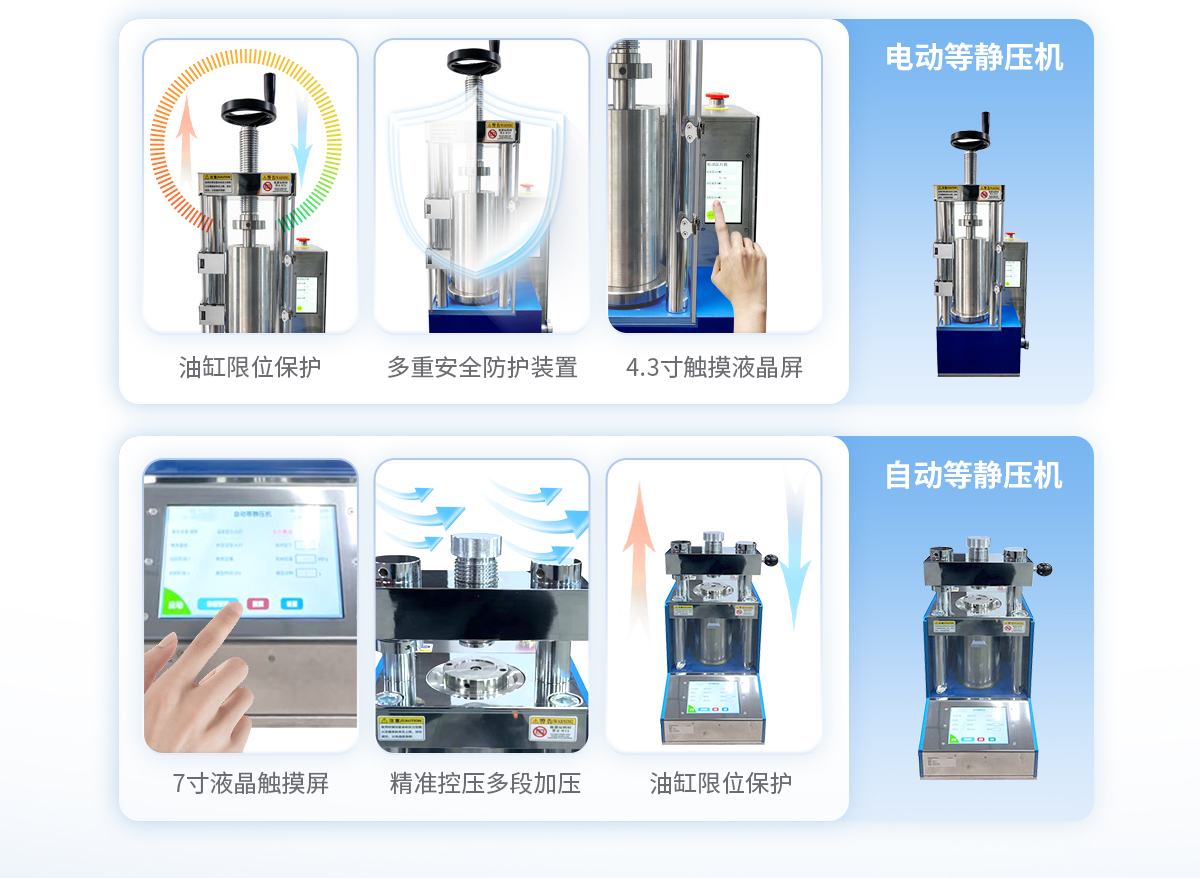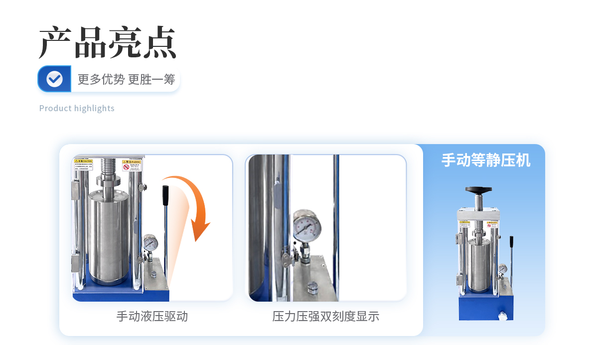该机采用手动液压驱动,是等静压系列中的入门机型,因其经济性,每次制样取样均需要搬动等静压腔体,适合制样少,对工作效率要求不高,有力气且安全意识较高的男士操作使用。