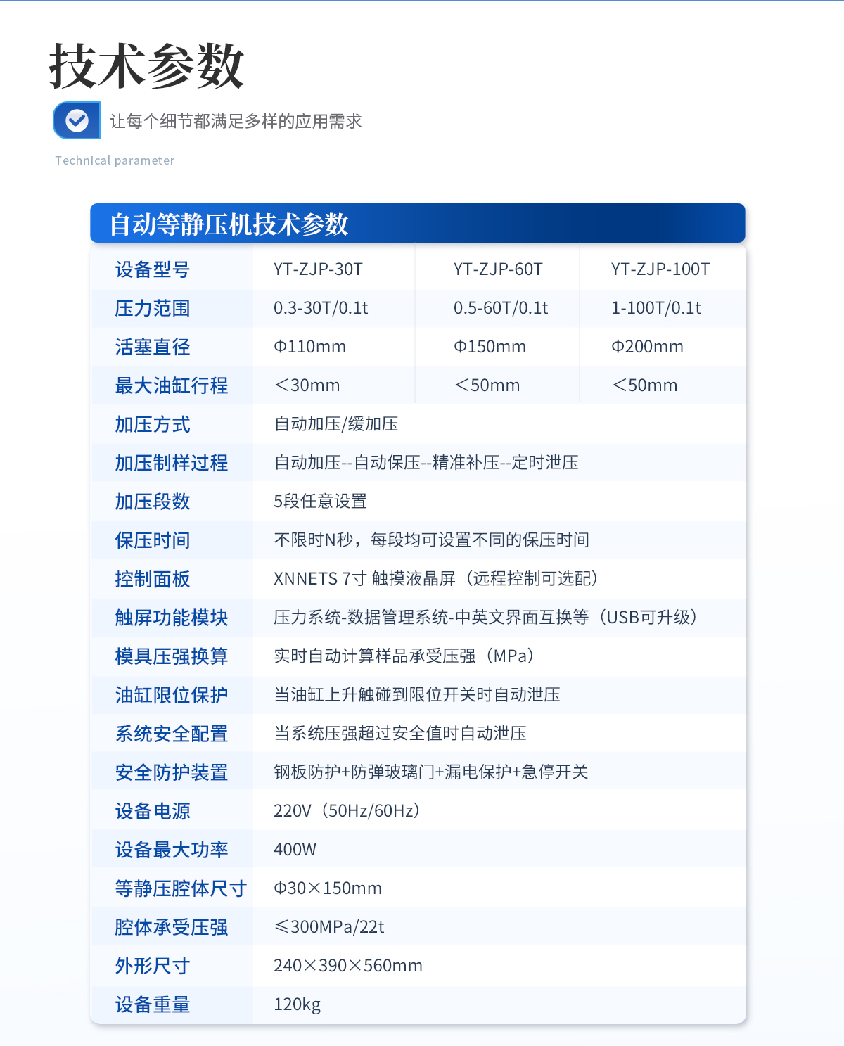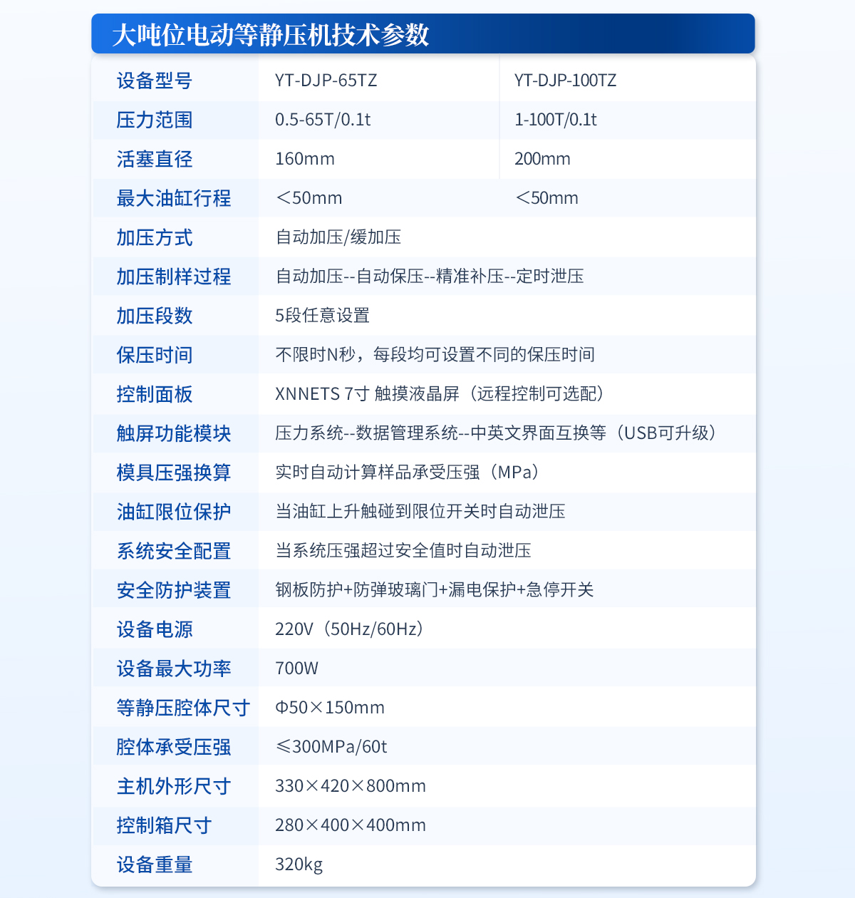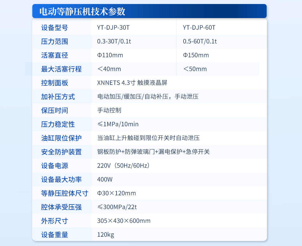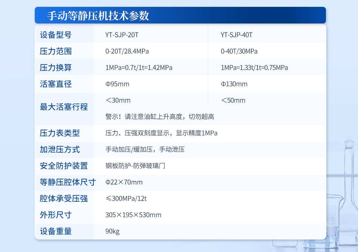 | 规格型号:YT-SJP-20T | 压力范围:0-20T/28.4MPa | 压力换算:1MPa=0.7t/1t=1.42MPa | 活塞直径:Ф95mm | **活塞行程: <30mm 警示!请注意油缸上升高度,切勿超高 | 压力表类型:压力、压强双刻度显示,显示精度1MPa | 加泄压方式:手动加压/缓加压,手动泄压 | 安全防护装置:钢板防护-防弹玻璃门 | 等静压腔体尺寸:Φ22×70mm | 腔体承受压强:≤300MPa/12t | 外形尺寸:305×195×530mm | 设备重量:90kg | 配置说明:油压机1台,等静压腔体1套!可根据需求定制500MPa等静压机或橡胶模具 |