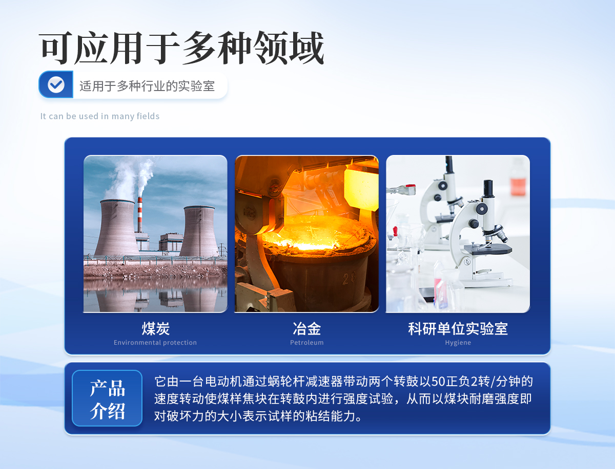 该仪器是测定炼焦用煤的粘结能力——罗加指数及粘结指数的专用仪器。适用于煤炭,冶金焦化部门及科研单位的实验室专用。它由一台电动机通过蜗轮杆减速器带动两个转鼓以50正负2转/分钟的速度转动,使煤样焦块在转鼓内进行强度试验,从而以煤块耐磨强度——即对破坏力的大小表示试样的粘结能力。