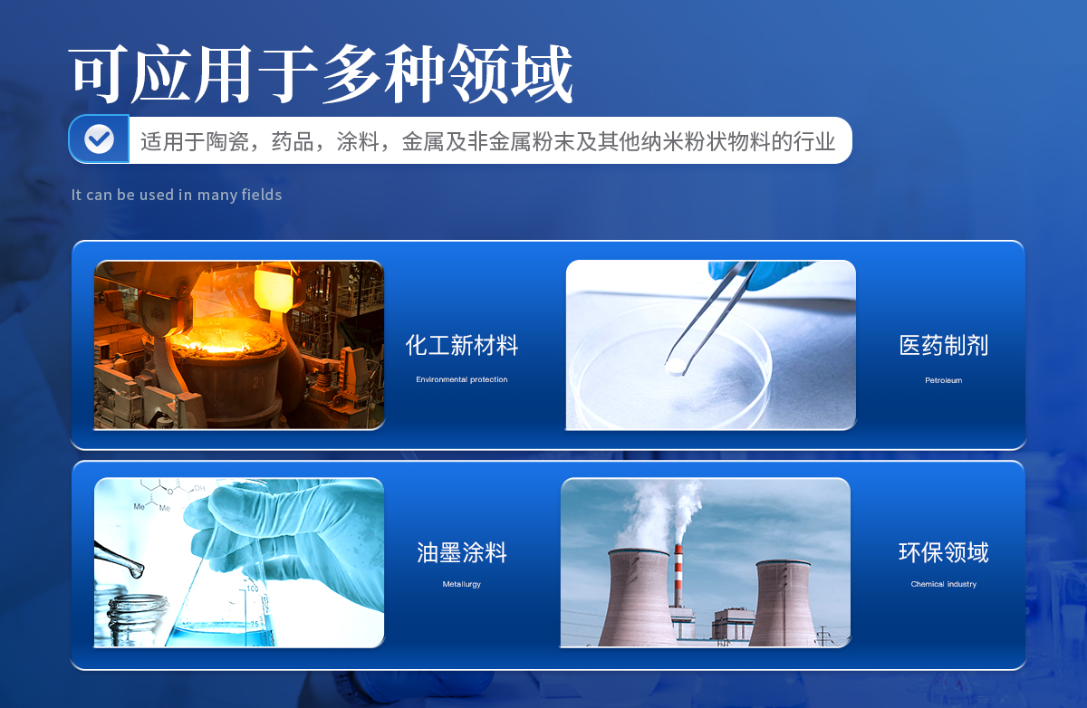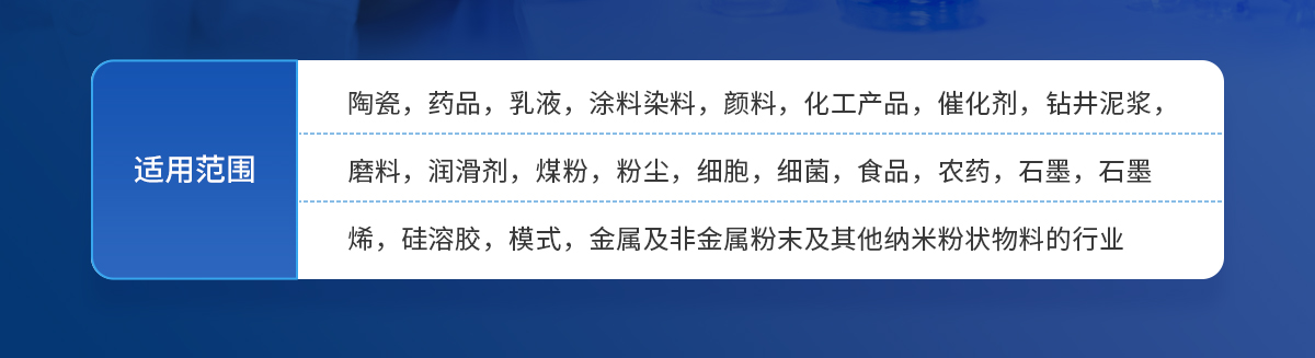 陶瓷,药品,乳液,涂料染料,颜料,化工产品,催化剂,钻井泥浆,磨料,润滑剂,煤粉,粉尘,细胞,细菌,食品,农药,石墨,石墨烯,硅溶胶,模式,金属及非金属粉末及其他纳米粉状物料的行业。