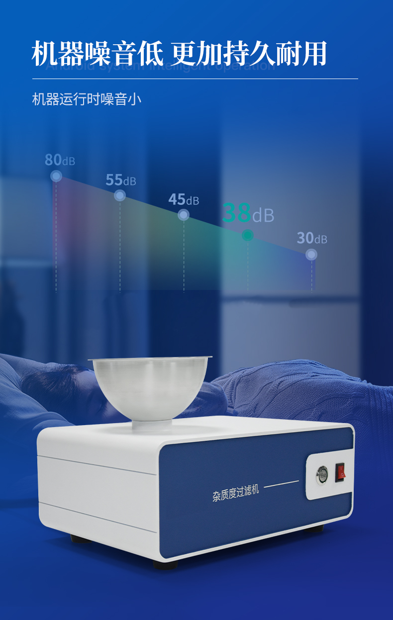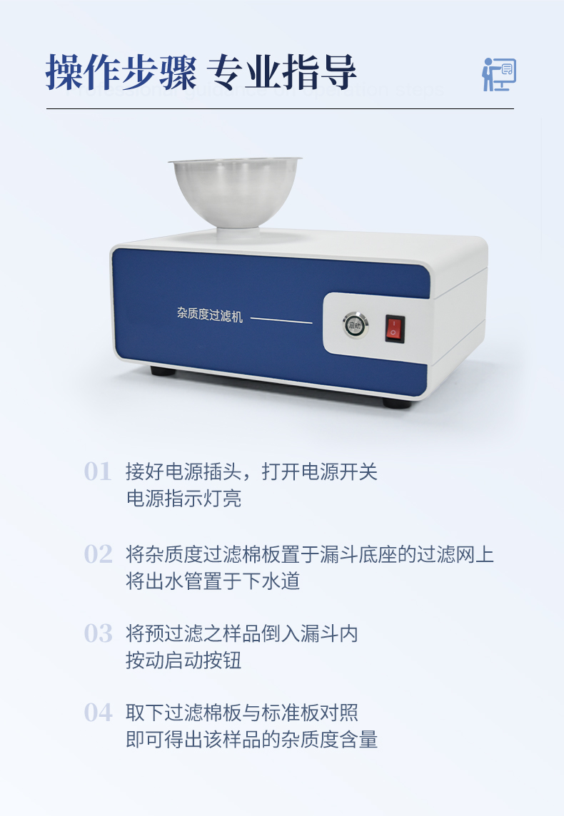 | 1. 接通电源,打开开关(指示灯亮)。 | 2. 将过滤棉板置于漏斗底座的过滤网上,出水管接入下水道。 | 3. 将样品倒入漏斗,按下启动按钮进行过滤。 | 4. 过滤完成后取下棉板,与标准板对照,判断杂质度含量。 |