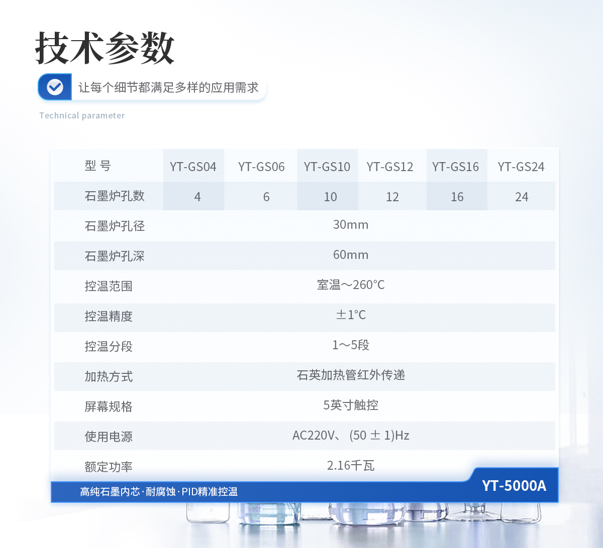 | 石墨炉孔:孔径30mm,孔深60mm,孔数4×3 | 控温范围:室温~260℃ | 控温精度:±1℃ | 控温分段:1~5段 | 加热方式:石英加热管红外传递 | 屏幕规格:5寸触控 | 主机外型尺寸:宽477mm×深415mm×高168mm | 使用电源:AC220V、 (50 ± 1)Hz | 额定功率:1.62千瓦 |