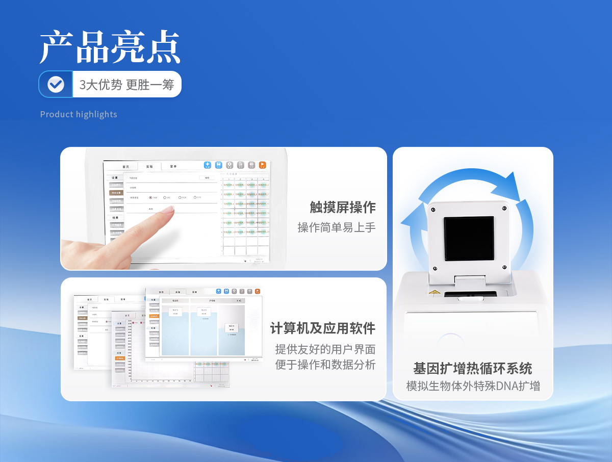 YT-P08型号 实时荧光定量PCR仪器的原理:聚合酶链式反应(polymerase chain reaction,PCR)是一种用于放大扩增特定的DNA片段的分子生物学技术,它可看作是生物体外的特殊DNA扩增,由高温变性、低温退火及适温延伸等几步反应组成一个温度循环周期,使目的基因得以迅速扩增,具有特异性强、灵敏度高、操作简便、省时等特点,是基因扩增技术的一次重大革新。PCR技术可将极微量的目标DNA特异地扩增上百万倍,从而大大提高对DNA分子的分析和检测能力。